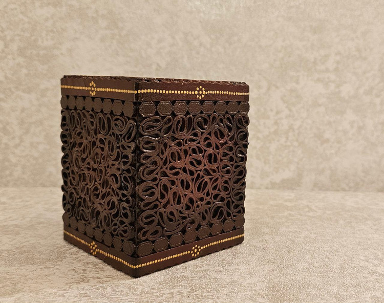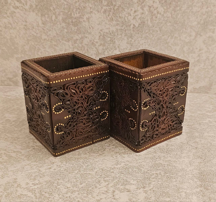 قلمدان معرق چرم، ساخته شده به صورت کاملاً دستساز با استفاده از چرم طبیعی و چرم خام شتر، نمونهای از هنر اصیل اصفهان است. این محصول ترکیبی از زیبایی، ظرافت و دوام است که میتواند هم به عنوان ابزار کاربردی برای نگهداری قلم و لوازم تحریر و هم به عنوان شیء تزئینی و دکوراتیو مورد استفاده قرار گیرد.