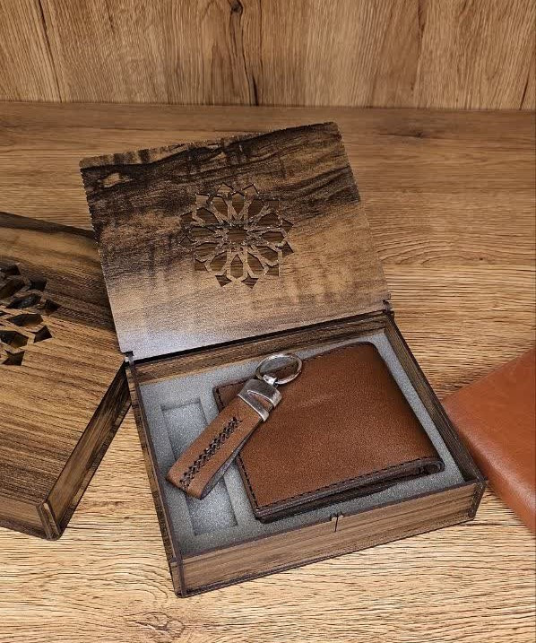 ست چرم طبیعی مردانه دوخته شده با چرم طبیعی گاوی.دارای 2 تکه.کیف پول جیبی که شامل 10 جای کارت و یک محفظه برای اسکناس .کاملا دستدوز. یک جا کلیدی با دوخت تزیینی و یراق طرح لبخند.از یراق آلات رنگ ثابت استفاده شده است.