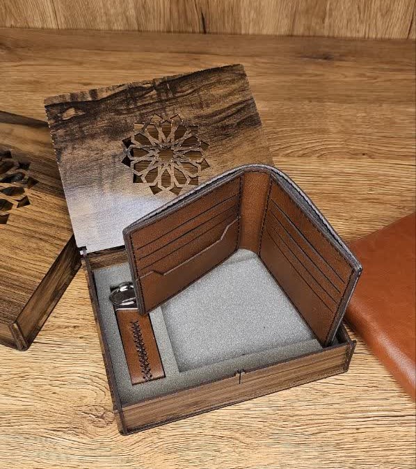 ست چرم طبیعی مردانه دوخته شده با چرم طبیعی گاوی.دارای 2 تکه.کیف پول جیبی که شامل 10 جای کارت و یک محفظه برای اسکناس .کاملا دستدوز. یک جا کلیدی با دوخت تزیینی و یراق طرح لبخند.از یراق آلات رنگ ثابت استفاده شده است.