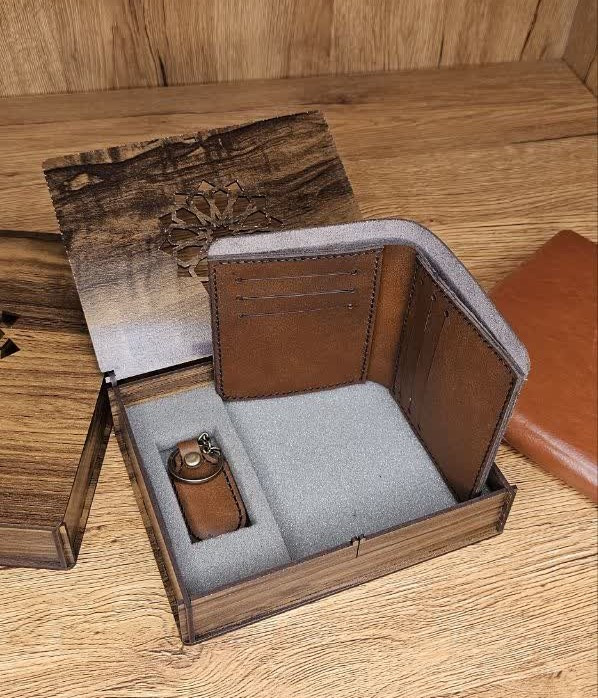 ست چرم طبیعی مردانه دوخته شده با چرم طبیعی گاوی.دارای 2 تکه.کیف پول جیبی که شامل 8 جای کارت و یک محفظه برای اسکناس .کاملا دستدوز. یک جا کلیدی طرح دیاکو.از یراق آلات رنگ ثابت استفاده شده است.