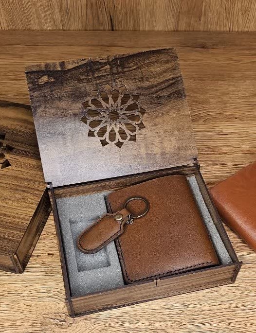 ست چرم طبیعی مردانه دوخته شده با چرم طبیعی گاوی.دارای 2 تکه.کیف پول جیبی که شامل 8 جای کارت و یک محفظه برای اسکناس .کاملا دستدوز. یک جا کلیدی طرح دیاکو.از یراق آلات رنگ ثابت استفاده شده است.