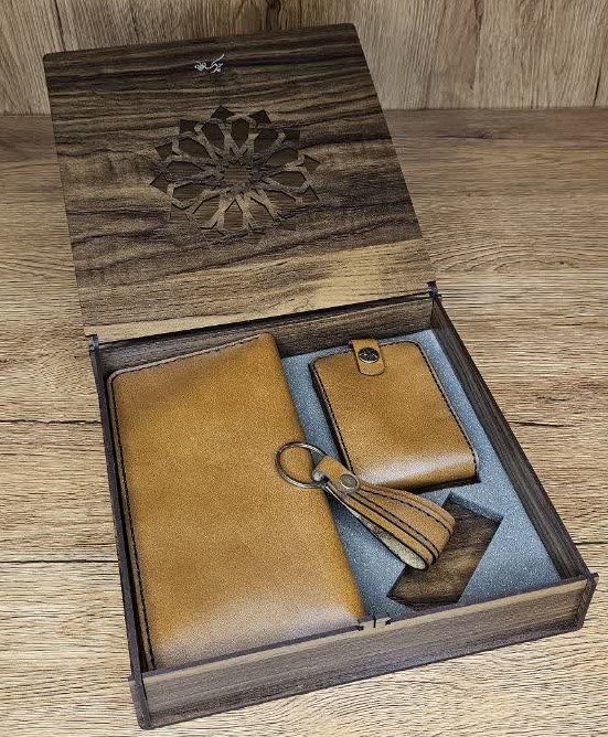 ست چرم طبیعی 3 تکه.دارای یک کیف پالتویی.یک جا کارتی مدل آکاردئونی ویک سر کلیدی.تماما دستدوز و چرم طبیعی گاوی.یراق آلات رنگ ثبات. کیف پالتویی: 9 جای کارت بانکی 2 جای اسکناس محفظه زیپ دار چرم گاوی ذرجه یک کیف کارت آکاردئونی: 4 جای کارت بانکی دکمه چهار پارچه